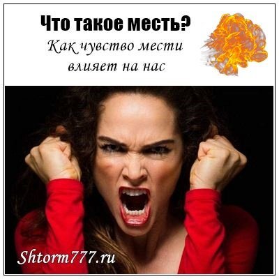 Чувство мести способно погубить не только душу, но и саму жизнь. Желание отомстить вызывается уязвленной гордыней, обидой за нанесенное оскорбление, ущерб. Тот кого оскорбили думает, что своей местью он сможет восстановить справедливость. Страстно желая "справедливого возмездия", он постоянно в своем воображении рисует картины мести. Чувство мести буквально сжигает человека, лишая его радостей жизни. Уязвленный носит внутри себя обиду и желание мстить, как камень на сердце или змею за пазухой. Часто чувство мести лишает даже разума.