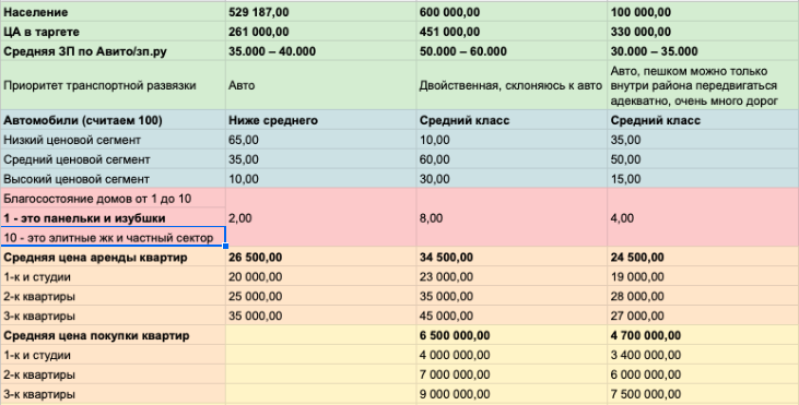 - Стоимость квартир – лучше делить и аренду, и покупку. Этот срез даст понять, сколько % от з/п люди тратят на жилье, дальше прикидывать остальные расходы и потом уже понимать, сколько они могут оставить в твоей кассе