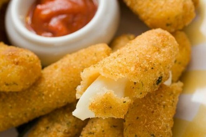 ИНГРЕДИЕНТЫ: ПРИГОТОВЛЕНИЕ: Порезать сыр полосками, обвалять в муке, яйцах и сухариках панировочных. Обжарить со всех сторон на масле до золотистости. Выложить сырные закусочные палочки на салфетку, чтобы стекло масло.