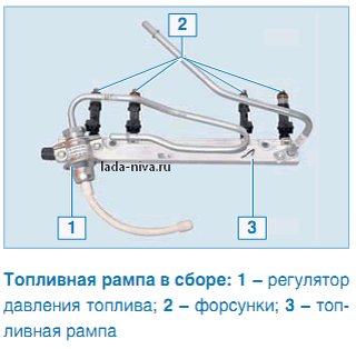 Топливная рампа снимается для проверки работы топливных форсунок и их замены, а также при снятии впускной трубы.