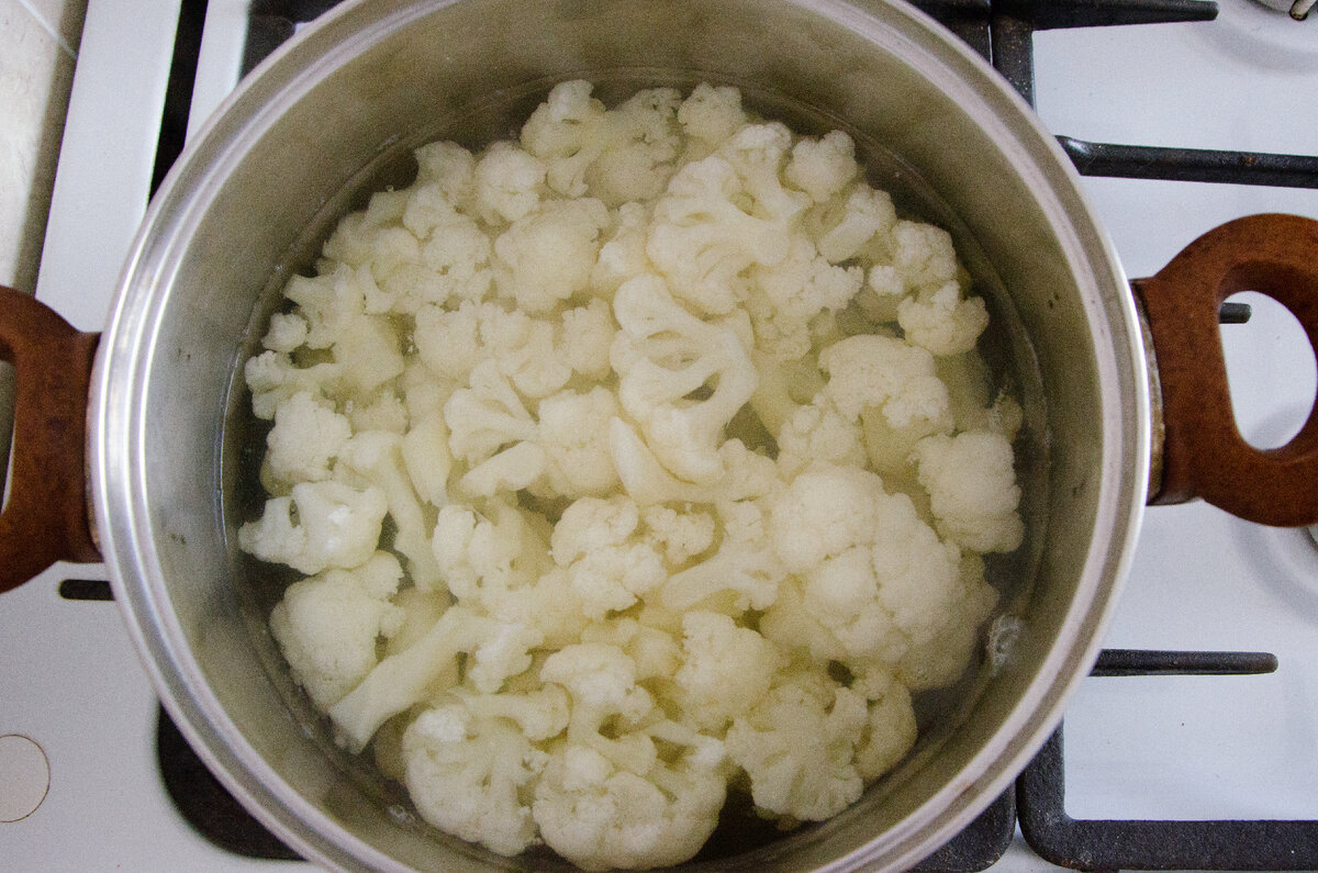 Цветную капусту разбираем на соцветия и отвариваем до готовности. Сливаем воду и даём немного остыть.