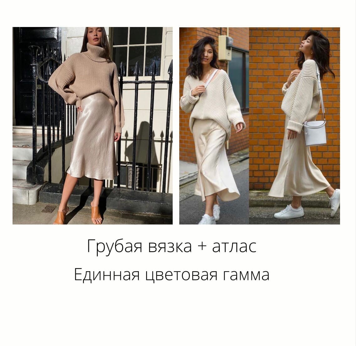 Игра с фактурой: при создании гармоничного образа можно поиграть с фактурами одежды. К примеру, выбираем атласную юбку и свитер крупной вязки, чтобы образ гармонировал используем одну цветовую гамму. Правило 2: