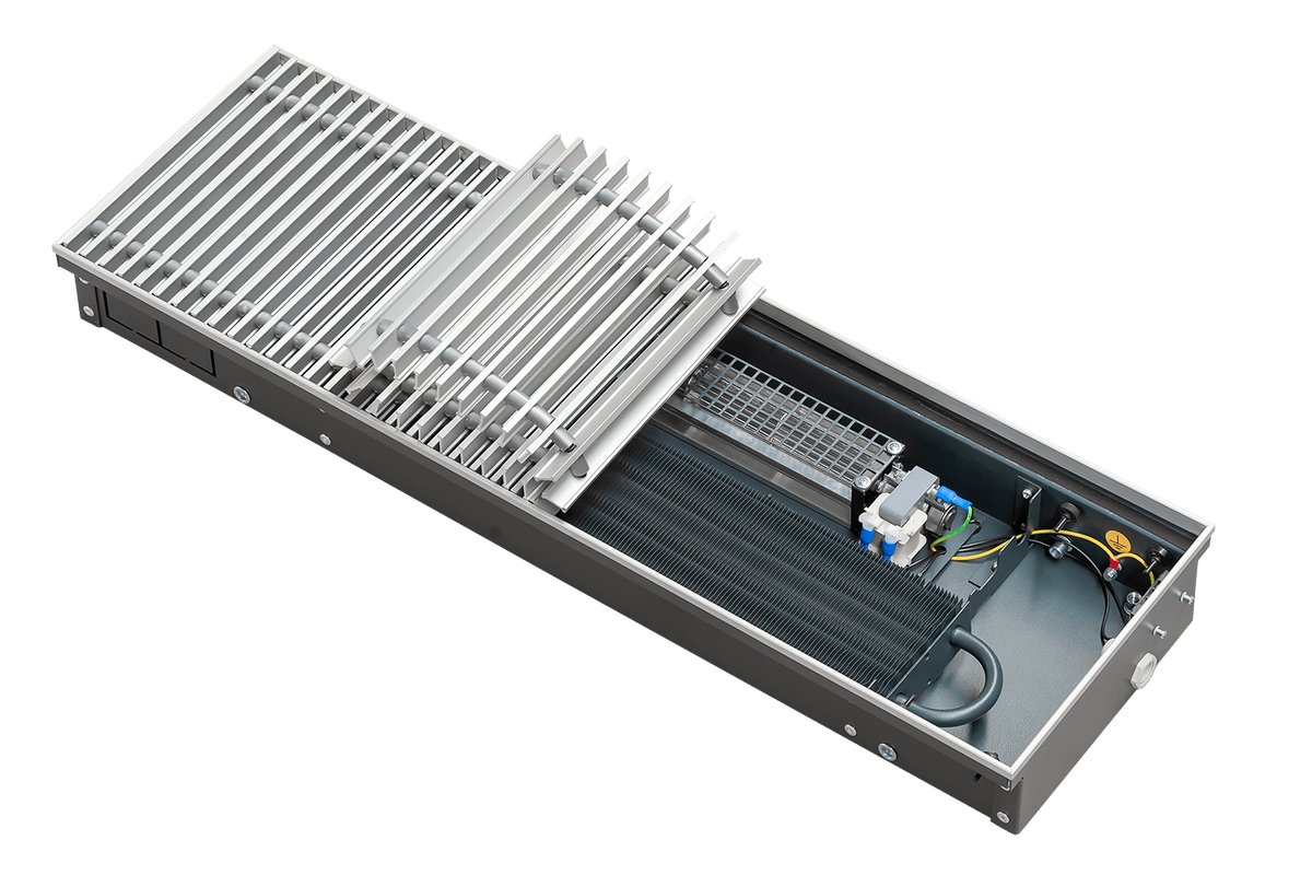 По типу теплоносителя конвекторы делятся на электрические и водяные. Конвекторы электрические встраиваемые устанавливаются по большей части в постройках, где водяное отопление недоступно. Они дороже в эксплуатации, чем водяные, и могут использоваться только в сухих помещениях. Тем не менее, встроенный электрический конвектор несколько проще в монтаже – к нему не нужно подводить трубы с теплоносителем, достаточно лишь подключить его к электросети.