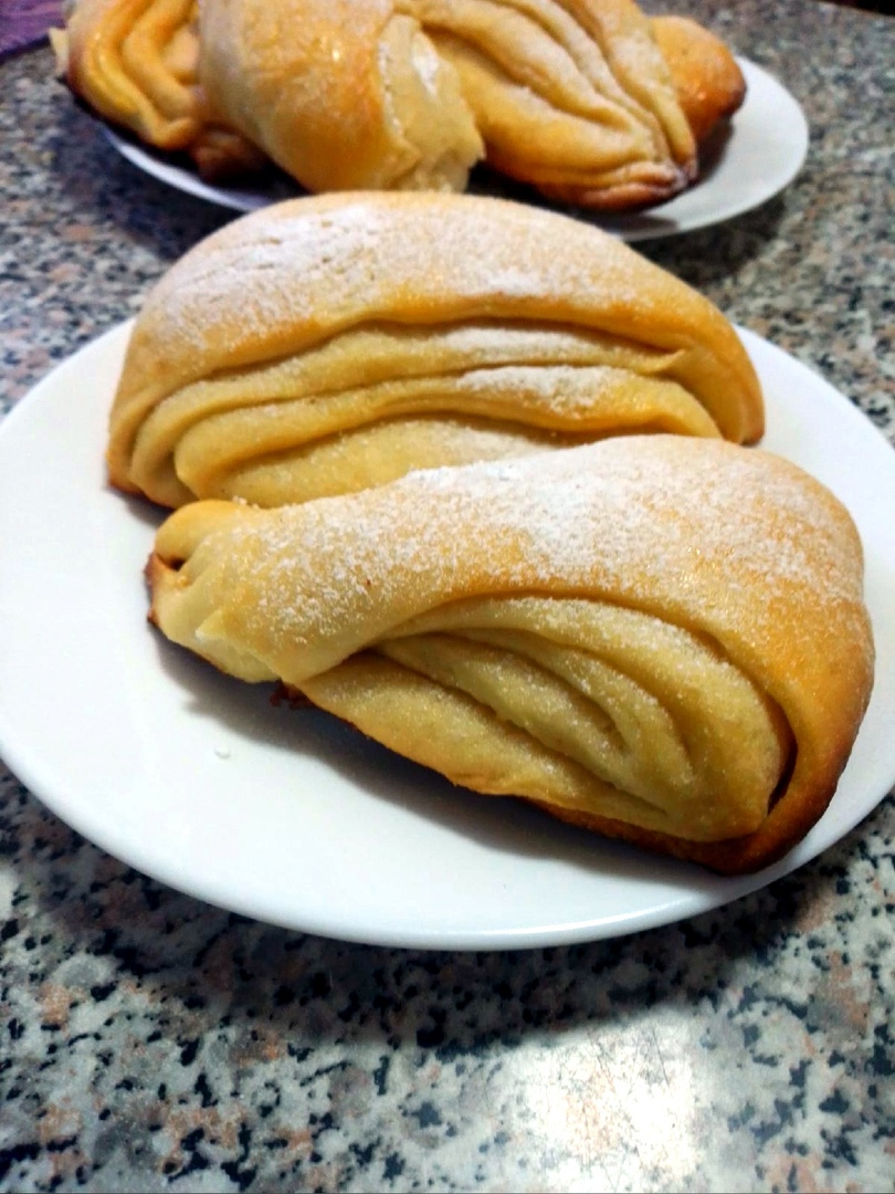 Очень вкусные дрожжевые булочки с очень интересной формовкой. Довольно простые в приготовлении и долго не черствеют. Булочки достаточно большими, так что хватит и семье, и угостить соседей) Ингредиенты: В теплом молоке растворить сахар, добавить дрожжи и оставить на 10-15 минут. Растопить сливочное масло и добавить 30 г в опару (я это делаю на глаз) Добавить яйцо и постепенно ввести муку и замесить тесто. Накрыть полотенцем и оставить для подъема на 1-1,5 часа. Начинаем формировать булочки. Тесто разделить на 3 равные части. Каждую часть раскатать, смазать первый слой растопленным сливочным маслом и посыпать сахаром. Я всегда еще посыпаю корицей, но сегодня ко мне придет приятельница, у которой аллергия на нее. Если у вас нет такой проблемы, то рекомендую корицу все таки добавить. Накрываем вторым пластом, так же смазываем маслом и посыпаем сахаром (с корицей). Затем накрываем третьим пластом. Смазываем маслом, посыпаем сахаром (с корицей). Теперь складываем наши пласты пополам. Нареза