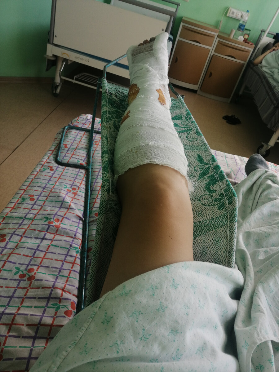 -После операции мне было так плохо, как никогда 😷🤕🤒😭 Перевязки каждый день. На ноге огромные шрамы, которые он смазывает йодом или йодовым раствором. Ногу перебинтовывают. Сама нога лежит в изначальном гипсе, только слегка отогнутым, не давит. Все это скреплено бинтом. Все это до сих пор болит, но по просьбе колят обезболивающее. Нервы у меня совсем уже никакие, все мне это тяжело выносить. Очень сильно корю себя за такую безбашенность. Не предполагала, что можно аж так сломать ногу. На ног