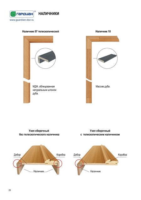 Наличники предназначены для декоративного обрамления межкомнатных и входных дверей. Они позволяют скрыть следы монтажа дверной конструкции и обеспечить законченный внешний вид проема. При выборе этих изделий учитывают стилистику помещения, а также предпочтения владельца. Форма изделия Лицевая сторона наличников бывает: Тип крепления В зависимости от способа крепления, наличники могут быть: Способ стыковки Соединение торцов планок может быть выполнено под углом 45° или 90°. В первом случае планки подрезают со стороны состыковки: такой способ подходит для изделий с любой формой поверхности. Стыковка под углом 90° может использоваться для планок с прямоугольным сечением. Модели с фигурной или полукруглой поверхностью так не устанавливают, т. к. выпуклая или фигурная часть будет возвышаться над состыкованной поверхностью.