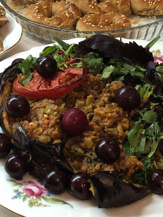 Сегодня я к Вам с баклажаном. Вернее сказать - с огромным баклажаном, начинённым мясным фаршем и овощами. У нас есть такой сорт баклажанов. Они очень вкусны, на вкус как будто грибы. Купила такой баклажан и решила его начинить. Но прежде чем начинить, надо его ещё опустошить. Срезала хвостик, очистила от мякоти, но не очень тонко: стенки должны остаться толстыми. Приготовила начинку для этого баклажанища. Припустила лук репчатый, добавила мякиш от баклажана, мелко его нарезав, помидорки , болгарский перец и фарш (мясо с луком прокрутила, добавила соль , куркуму и всякие пряности, и готовила под закрытой крышкой до упаривания всей жидкости) Всё перемешала, добавила зелень - базилик, кинзу, укроп. Начинила всем этим баклажан. Затем отправила все в горячую духовку минут на 30-40. У меня за это время пропекается. Вы сами смотрите по ходу. Затем вытащила из духовки, положила на тарелку и разрезала как арбуз, дольками. При подаче можно добавить кисломолочный продукт, ну кефир, сметану