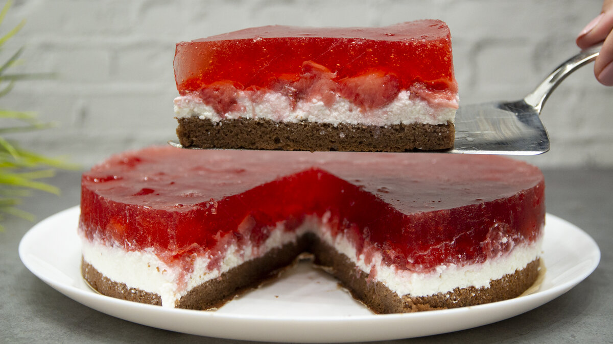 Нереально вкусный клубничный торт! Я уверена, что и у Вас он будет любимчиком. Нежный, в меру сладкий, лёгкий и простой в приготовлении, ингредиенты самые доступные, которые есть у каждой хозяйки. В общем не рецепт, а находка! Рекомендую от души! СПОСОБ ПРИГОТОВЛЕНИЯ: Начнём с желатина, так как ему нужно время набухнуть. Заливаем 25 г желатина 150 мл холодной воды, перемешиваем и отставляем пока в сторону. Берём творог, желательно мелкозернистый, у меня 9 %-ый, добавляем к нему 2 ст.л. сгущёнки, 1 ст.л. сметаны и по желанию ещё можно добавить ванилин, хорошо перемешиваем и творожная начинка у нас готова. А теперь давайте подготовим клубничный слой с желе. Для этого нам понадобится 500 г клубники. Крупную ягоду разрезаем на 2 или 4 части. Кастрюлю с клубникой ставим на плиту, вливаем в неё 150 мл воды и доводим до кипения. Как только ягода закипела сразу снимем с огня. И в горячую клубнику добавляем по вкусу сахар, я всыпаю 3 ст.л., перемешиваем и пока отставляем в сторону, чтобы клуб