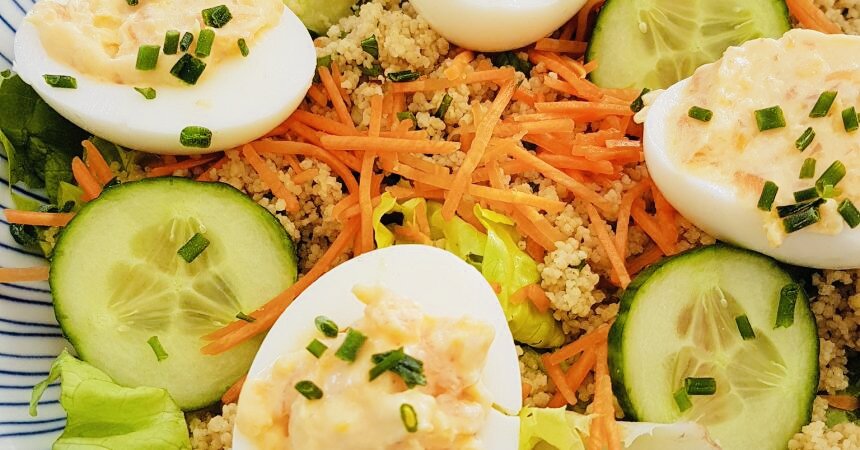 Если вы поклонник майонеза в сопровождении яиц и обращаете внимание на то, что вы едите, у меня есть очень хороший небольшой рецепт, чтобы украсить тарелку с сырыми овощами:: яйца с копченым лососем, сливочные и вкусные. Рецепт приготовления? Более чем простой! Яйца, сваренные вкрутую, небольшой кусочек копченого лосося плюс простой сливочный и очень легкий соевый йогурт. Вы можете адаптировать мой рецепт не к лососю, а к остаткам вареного лосося, копченой скумбрии с перцем или даже к двум-трем креветкам. Подавайте с хорошей тарелкой сырых овощей, приправленных столовой ложкой смеси из лимонного сока и растительного масла. Делайте себе такой легкий и изысканный завтрака всего пару раз в неделю и вы отметите своё хорошее самочувствие и настроение!
