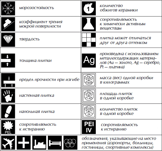 Комментирую только принципиально важные. Начну с изображений на коробках плитки. 2. Коэффициент трения (скользко или нет). Настенная плитка. Если знака нет - значит плитка универсальная. Но на пол - всегда только напольную. 3. Сопротивляемость к истиранию актуально только для напольной.