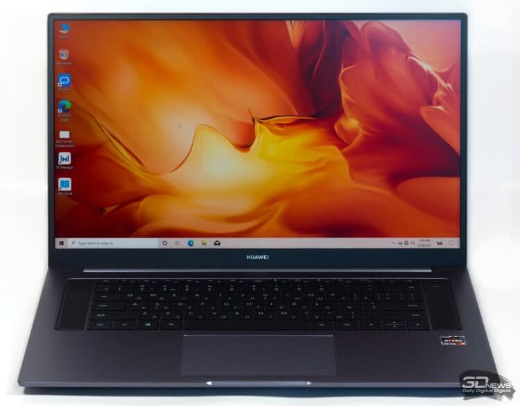 Визитная карточка HUAWEI MateBook D 16 AMD — это, разумеется, крупный экран с диагональю 16,1 дюйма. Благодаря узким рамкам его удалось вписать в габариты, характерные для 15-дюймовых ноутбуков прошлых лет: точно так же, как 14-дюймовые лэптопы фактически убрали с рынка своих 13-дюймовых предшественников. Конечно, MateBook D 16 AMD все еще крупнее большинства ультрабуков, но по остальным параметрам это по-прежнему типичный ультрабук: устройство весит всего 1,74 кг, а его толщина составляет всего 18,4 мм.