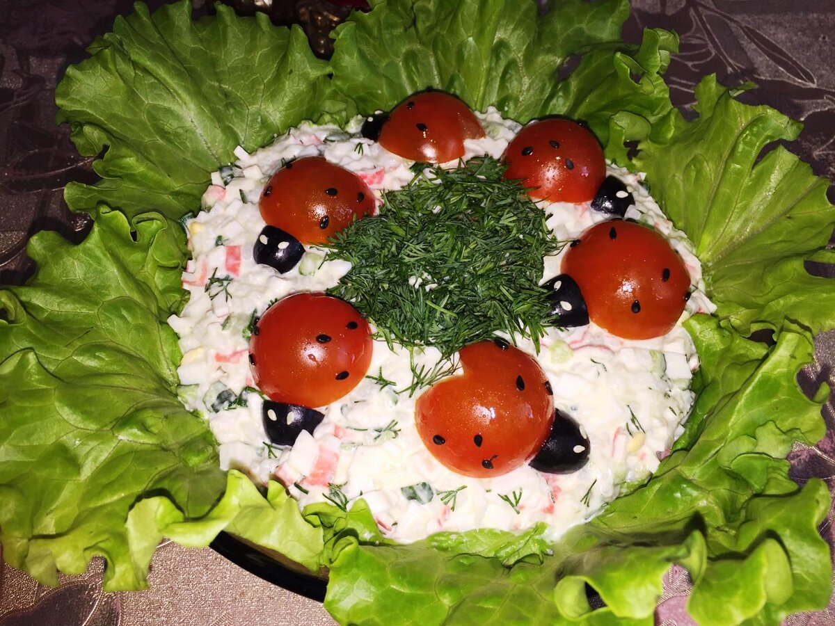 Уже давно подзабыли крабовый салат, который одно время не сходил со всех праздничных столов. Потом приелся и отошел. Когда делала этот салат «Божья коровка», то сначала подумала, что вдруг будет похожим…Но нет! Крабовые палочки заиграли по-новому. И очень вкусно! Предлагаю попробовать. Делается просто и без заморочек. Приготовим такие продукты: 200 г отварного риса 200 г крабовых палочек 4 отварных яйца 1-2 свежих огурца Зеленый лук Свежий укроп Майонез, соль Для оформления: Листья зеленого салата Петрушка 3 шт. красных помидорки черри Черные маслины 3 шт. для головок букашек Черный кунжут для пятнышек Белый кунжут для глазок Приготовление салата: Нарезаем кубиками яйца, крабовые палочки, добавляем рис. Также нарезаем кубиками огурцы (можно почистить). Затем мелко режем небольшие пучки зеленого лука и укропа. Все перемешиваем с майонезом (берем небольшое количество) и подсаливаем по вкусу. На блюдо выкладываем листья салата. Затем небольшой горкой сам салат. Тонкий слой майонеза. Крас