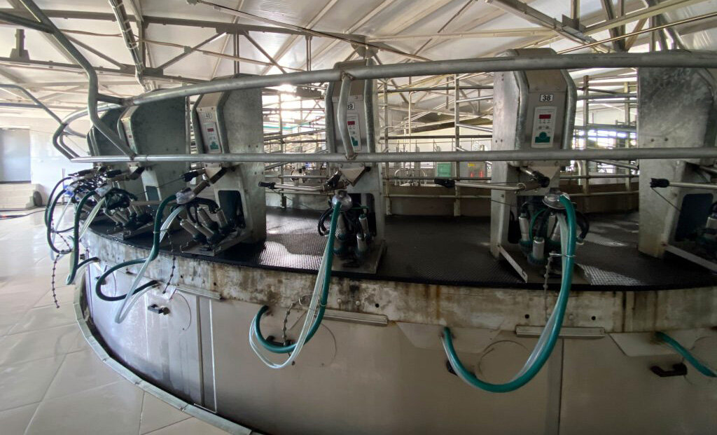 Принцип автоматизация доильного зала, процесс ускорить доение молока. Пропускная способность такого зала — больше ста животных в час. • поточная технология; • высокая интенсивность работы; • эффективность работы; • наиболее высокая производительность. Доильный зал «Карусель» представляет собой подвижную платформу, на которой установлены боксы для доения. Платформа перемещается на двух двутавровых балках и оборудована нейлоновыми роликами особой конструкции, осуществляет поворот по рельсовому пути. Система электропривода с регулируемой скоростью обеспечивает плавную работу механизма. Молочные, промывочные, вакуумные и фильтрующие линии проложены под платформой. Панель управления контролируется процесс начала и окончания дойки. Коров группами приводят в доильный зал к местам для коров обустроены таким образом, что коровы стоят практически неподвижно, но при этом не испытывают дискомфорт. Коровы сами подъезжают к оператору где прикрепляет к вымени соски доильного аппарата, которые и доят