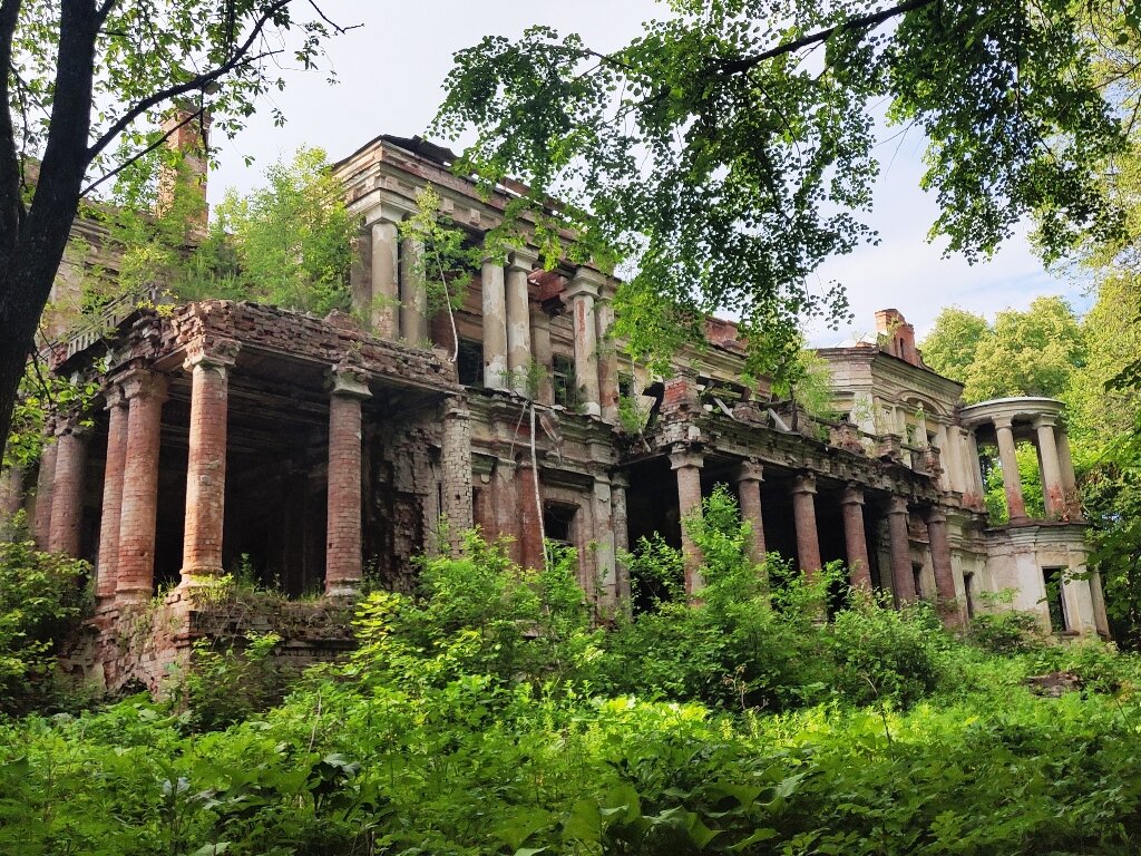 И опять мы едем в разрушенную усадьбу. Как-то меня начал уже утомлять этот довольно однообразный процесс. Плохими дорогами добираемся до места, ставим машину на пыльной площадке или заросшей лужайке и идем к очередной усадьбе. А там разрушенный, глядящий пустыми проломами окон на мир дом. На крыше (если она еще есть) растут деревья, и вообще все, что осталось, старается спрятать и хоть немного облагородить вид руин разная растительность. Крапива закрывает разрушенные ступеньки, а густая листва кустов и деревьев прячет стены и башни. Такое впечатление, что попал в джунгли, где все зарастает с огромной скоростью. Но ведь у нас не тропики, и чтобы все так поросло быльем, должны пройти годы и годы. В общем, впечатление и настроение очень тягостные.