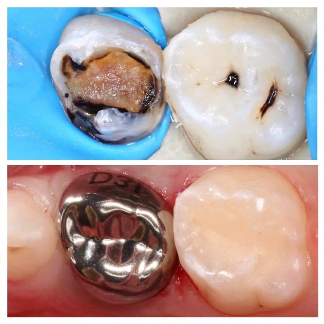 Чернота на зубах — это последствия серебрения. Как видите, оно не спасло зубки от разрушения. Пациенту 3 года. Кариес основательно разрушил "четверку" и перерос в пульпит. Твердых тканей осталось мало, большую пломбу ставить не рекомендуется. Поэтому, доктор Светлана Кожемякина зуб вылечила и закрыла металлической коронкой. Теперь он прослужит до физиологической смены, а это примерно через 6–7 лет. Разрушение на "пятерке" небольшое. Это средний кариес. ✔️Пораженные ткани убраны; ✔️Зуб отреставрирован пломбировочным материалом; ✔️И отполирован вкусной пастой. ИМЕЮТСЯ ПРОТИВОПОКАЗАНИЯ. НЕОБХОДИМА КОНСУЛЬТАЦИЯ СПЕЦИАЛИСТА.