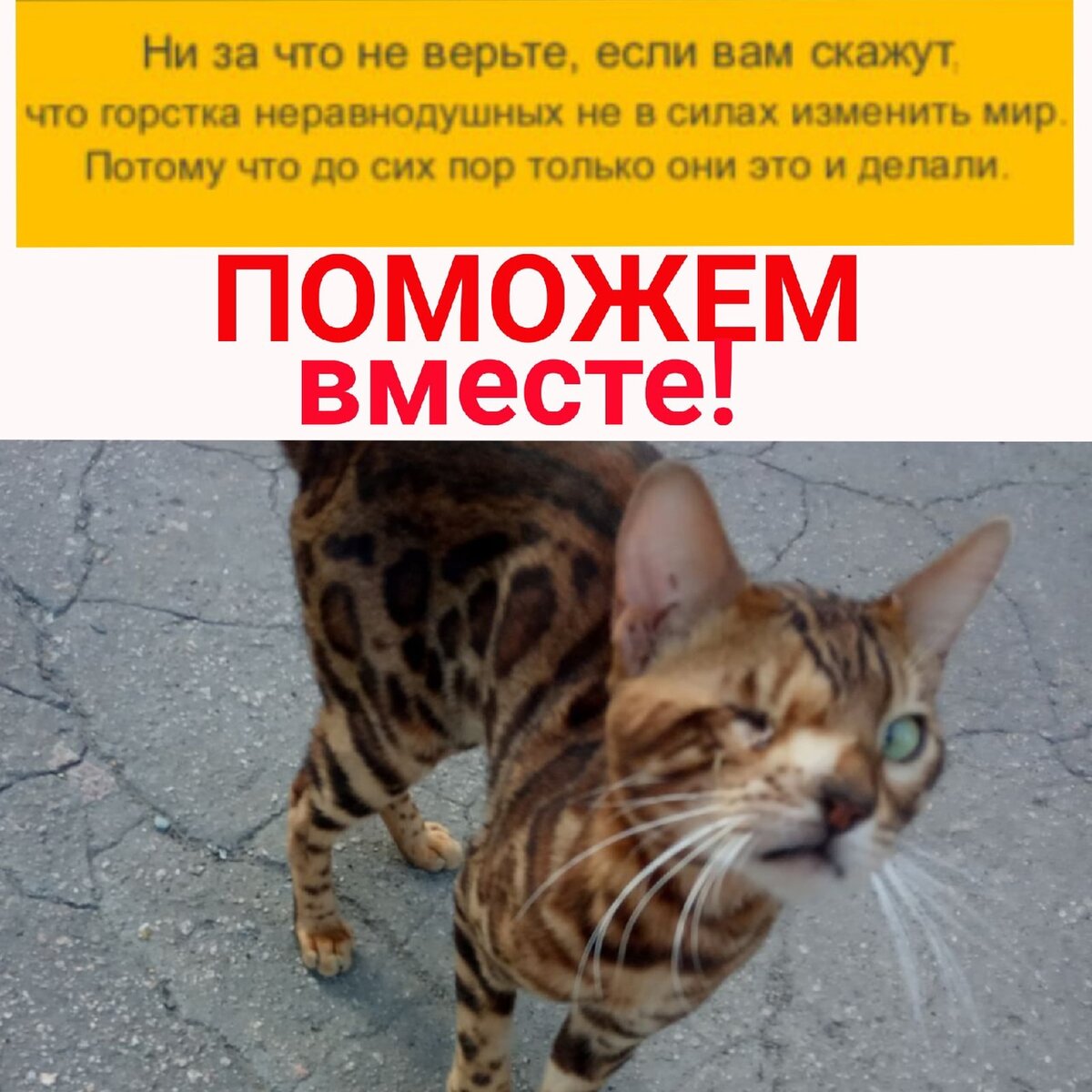 Не так давно волонтерам стало известно про котика Бенгальской породы, который просто так бегал по улицам Макеевки. КОТ ЫЛ В УЖАСНОМ СОСТОЯНИИ! ГЛАЗА НЕТ! ИСТОЩЕН! ГОЛОДНЫЙ ДО БЕЗУМИЯ! БЕГАЛ ЗА КАЖДЫМ ПРОХОЖИМ! Естественно, мимо такой ситуации волонтеры пройти не могли. Сердце защемило. Погибнет кот там ведь без внимания... Выехали за мальчиком в Макеевку, спасибо друзьям Яны и Андрею помогли с машиной. Назвали красавца Зевс, определили на передержку. Записались на осмотр в клинику Верный Друг, провести полное обследование и посмотреть, что с глазом, есть ли глаз вообще. Нам с Зевсом предстоит долгий и нелегкий путь, до полного восстановления животного. Курирует его волонтер Виктория П. Мальчик будет полностью обработан от паразитов, на нем они просто кишат, полностью будет обследован, кастрирован и привит. И конечно же надо откормить парня. Только после полного восстановления, мы будем заниматься его счастливым билетиком! Чтоб парень больше не знал, что значит скитаться по улице и что