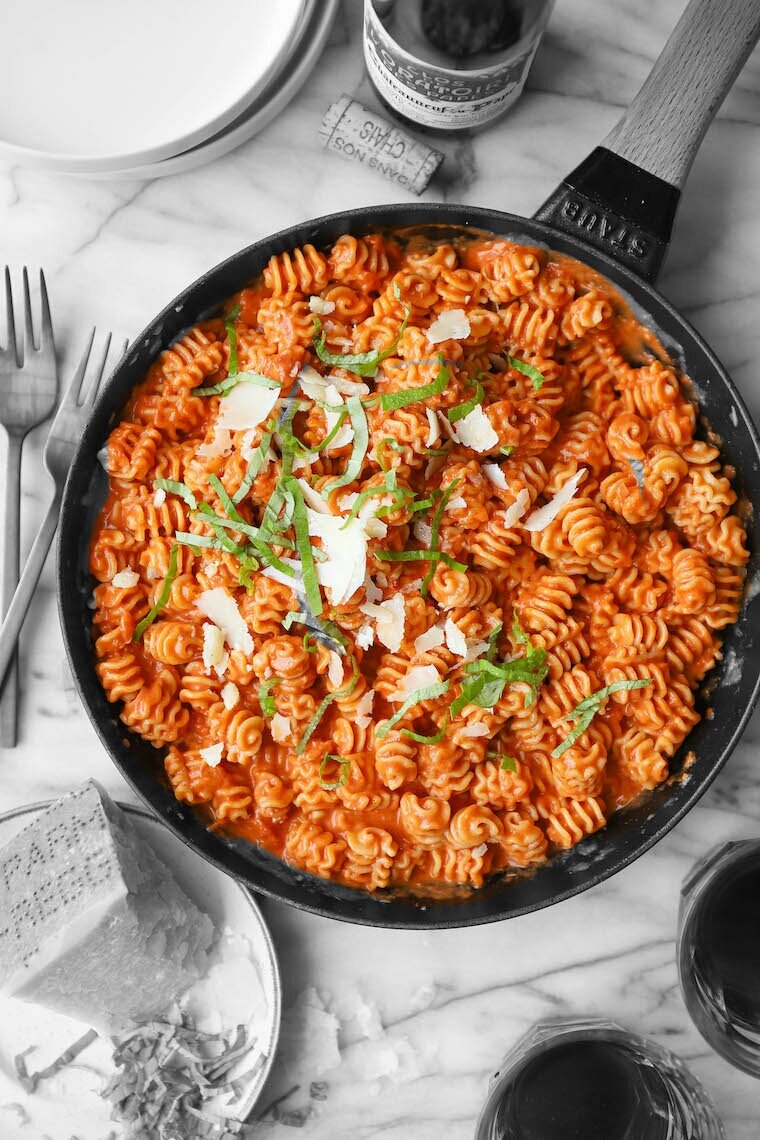 Всес привет! Посидели мы тут в выходные с друзьями, проснувшись на утро была обнаружена бутылка водки. Сразу пришла мысль выпить, шучу. Было решено попробовать рецепт макарон с водкой. Получилось очень даже очень. И так что нам понадобится : Все ингредиенты в сборе, собираюсь сам и поехали. Вчера радовали печень, сегодня порадуем желудок. Отвариваем макароны, подойдут любые. Сливочное масло растапливаем на сковороде, добавляем лук и чеснок, обжариваем на среднем огне 4-5 минут. Добавляем острый перец, потом томатную пасту готовим одну минуту, после выливаем водку перемешиваем. После добавляем томаты и одну ложку сахара, уменьшаем огонь со среднего до минимального и оставляем на десять минут, идём отдыхать. Отдохнули, теперь смотрим, если масса загустела добавляем сливки и натртый пармезан около 100 грамм. Варим около двух минут помешивая до однородной массы на среднем огне. Берём нашу кастрюлю с макаронами и вмешиваем наш водочный соус. Приправляем все листиками базилика и пода
