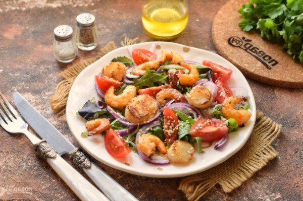 Вкуснейший салатик приготовленный из гребешков и рукколы