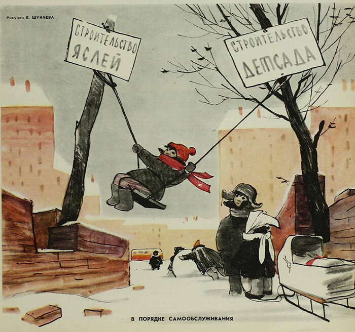 Благоустройство городов и ненавязчивая забота чиновников о гражданах - большие проблемы не только СССР, но и современной России. Даже сложно ответить на вопрос, когда было лучше. Строительство объектов инфраструктуры значительно проигрывает ударному темпу сдачи многоквартирников. Сейчас ещё застройщики играют в игру, кто выше построит, да на меньшем участке. Паркинги, зелёные дворы и детские площадки делаются по остаточному принципу и "на отвяжись". В городах отдаётся предпочтение автомобилистам, а не пешеходам. Хотя, кажется, в мегаполисах всё же наметилась положительная тенденция. Неизменным остаётся правило - главное отчитаться о проделанной работе, а уж как там всё дальше сложится неважно. Долгострой - извечная проблема. Реновация глазами советских карикатуристов из "Крокодила". Интересно, что как в СССР, так и сейчас при строительстве или ремонте домов, улиц крайне мало думают о жильцах и пешеходах. При ремонте тротуара приходится рисковать жизнью и бежать по дороге. Рядом со стро