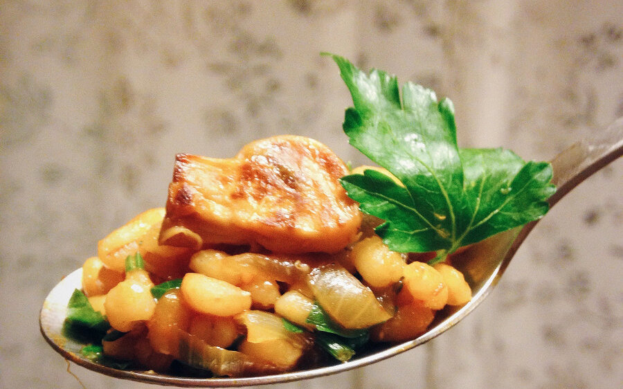 Чуть посолить и добавить мускатный орех, перец — по вкусу. 4. Смешать в сотейнике готовую перловку с грибами, продолжая держать их на медленном огне. 5. Добавить соевый соус и томатную пасту, перемешать. При необходимости можно добавить воды, я добавляла 0,5 стакана для более нежной консис