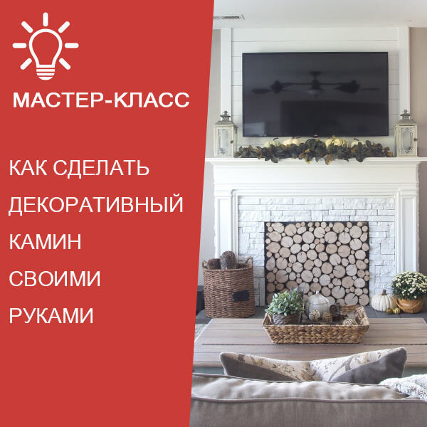 Потрескивание поленьев, уютные язычки пламени... Ну почти! Уже на этапе работы вы начнете получать наслаждение и восторг, а уют обещаем по завершению. Начинаем мастер-класс! Нам потребуется: Общая стоимость: 4 500 рублей. Общее время: 2 дня. Мы не будем говорить про точные измерения, поскольку для вашей комнаты они будут свои. Однако, помните, что лучше сделать камин большой, чем маленький — так он не «потеряется» в интерьере. Шаг 1. Находим центр стены и определяемся с расчетами. Для основы берем бруски 100*50: длина должна быть чуть больше запланированного камина. Делим основу на четыре одинаковые секции — все дощечки забиваем на гвозди. Шаг 2. Затем прибиваем фанеру (2 м*50 см) к раме - получаем подиум. Переходим к основной части - порталу. Разрезаем фанерные полосы и прикручиваем к задней части каминной доски. Из фанеры создаем тоннель глубиной 25 см и размещаем его на расстоянии 60 см от стены. В работе мы используем шурупы для гипсокартона. Шаг 3. На фортепианную петлю садим двер