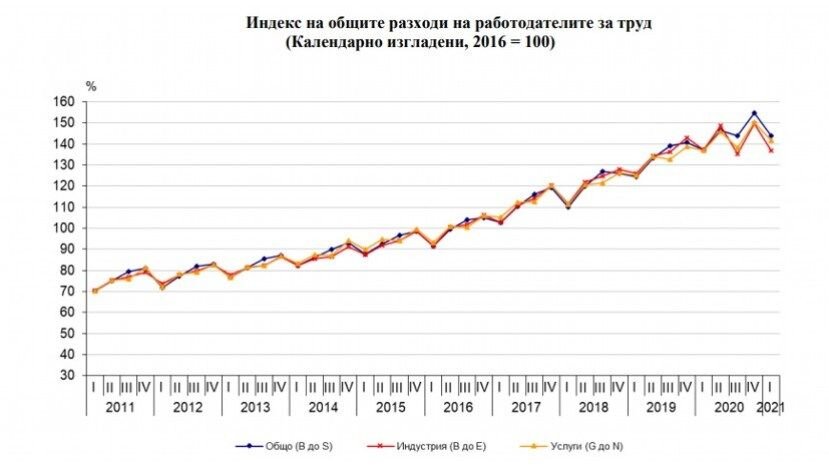 По предварительным данным Национального института статистики, в первом квартале этого года общие расходы работодателей в Болгарии за один отработанный их служащими час увеличились на 4.9% по сравнению с первым кварталом 2020 года...Расходы работодателей в Болгарии выросли на 4.9%