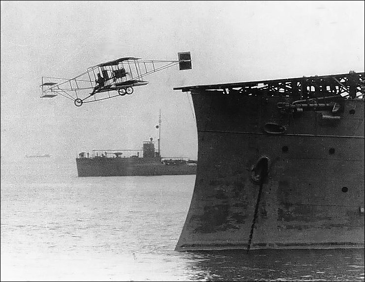 Первые гидросамолёты-разведчики появились на крупных кораблях многих стран. Спускались и поднимались обратно на борт с помощью крана. Или отправлялись в воздух с помощью специальной катапульты, но возвращались, опять же с воды с помощью крана. А впервые взлёт со специальной деревянной площадки на крейсере "Бирмингем" на самолёте с колёсным шасси совершил американец Юджин Эли 14 ноября 1910 года: