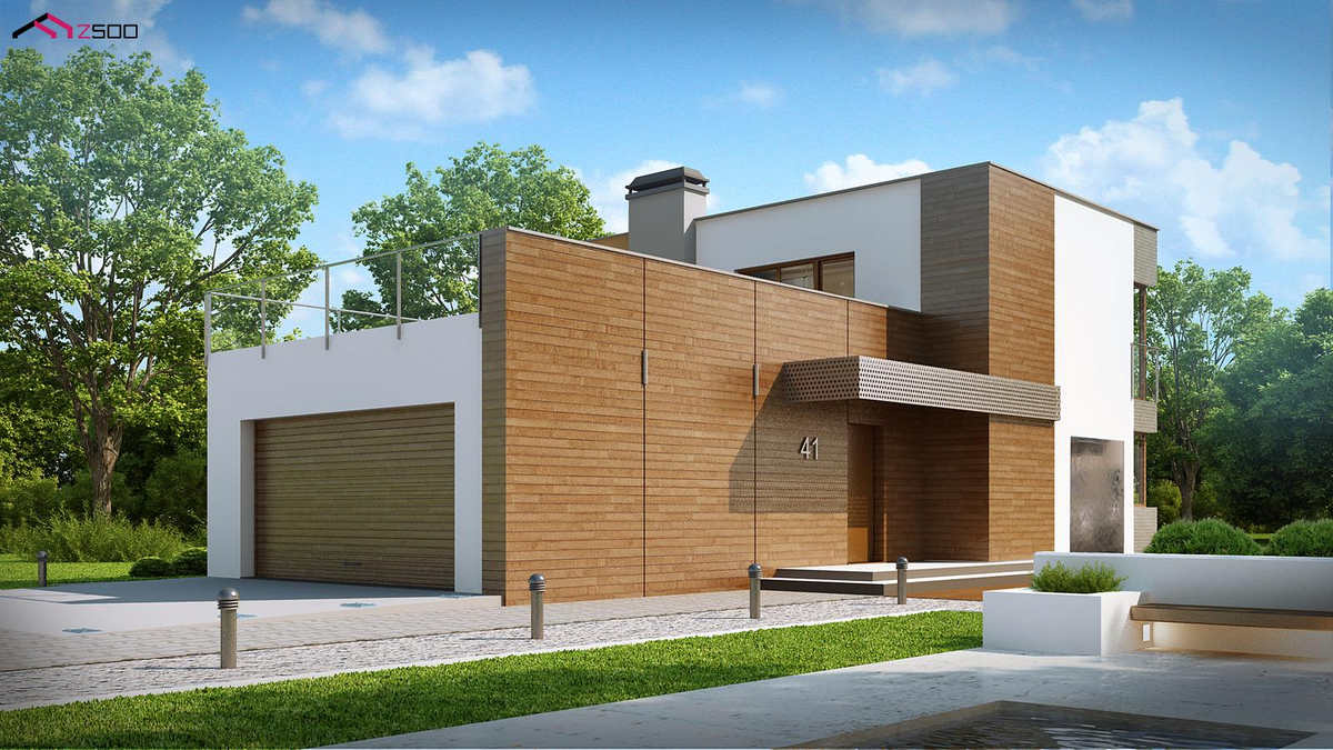 Zx41 Практичный двухэтажный дом в стиле модерн с обширной террасой над гаражом.