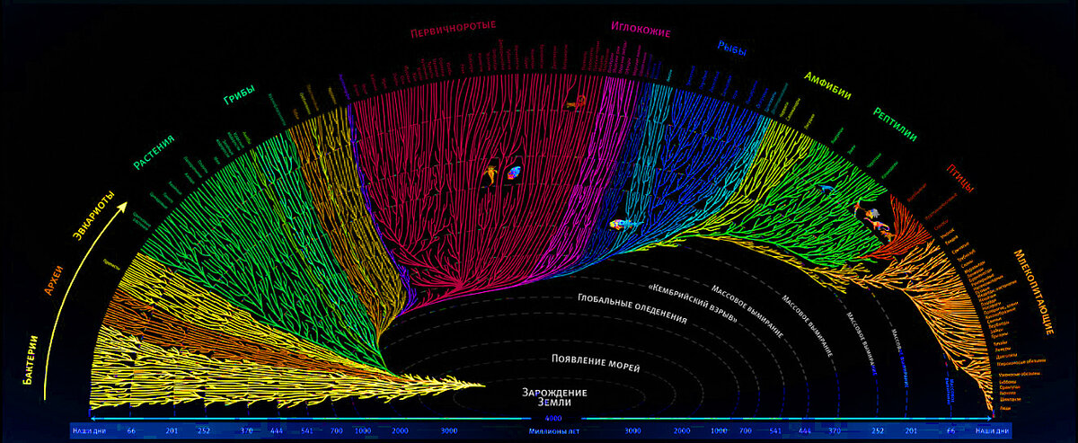 Сегодня вы узнаете, как давно мы перестали быть обезьянами, что нас связываем с кошками и как выглядели наши древние предки. Все, кто доверяет теории эволюции, знают, что мы потомки обезьян. Вывод не тривиальный, ведь мы на них похожи (девушки, вы не похожи конечно, это я о мужиках) и у нас естественно есть общие предки. Но многие слышали например, что наш ДНК на 50% схож с бананом и картофелем, а с огурцом и того больше. Получается, родственники всего живого, хоть и очень дальние? В общем да, но интересно не это. Когда-то давно все живые организмы выбрали разные эволюционные пути. Предок огурца пошел в одну сторону, а наш - в другую. То же самое со всеми остальными. Но как давно эти пути разошлись? Когда предок человека принял решение, что не будет овощем? Есть такое понятие, как дерево жизни. Десятки умов составляли карты эволюции и пытались понять, насколько мы там все друг другу родня. В итоге самой популярной и проработанной оказалась эта: Она настолько детальна, что тут почти ни