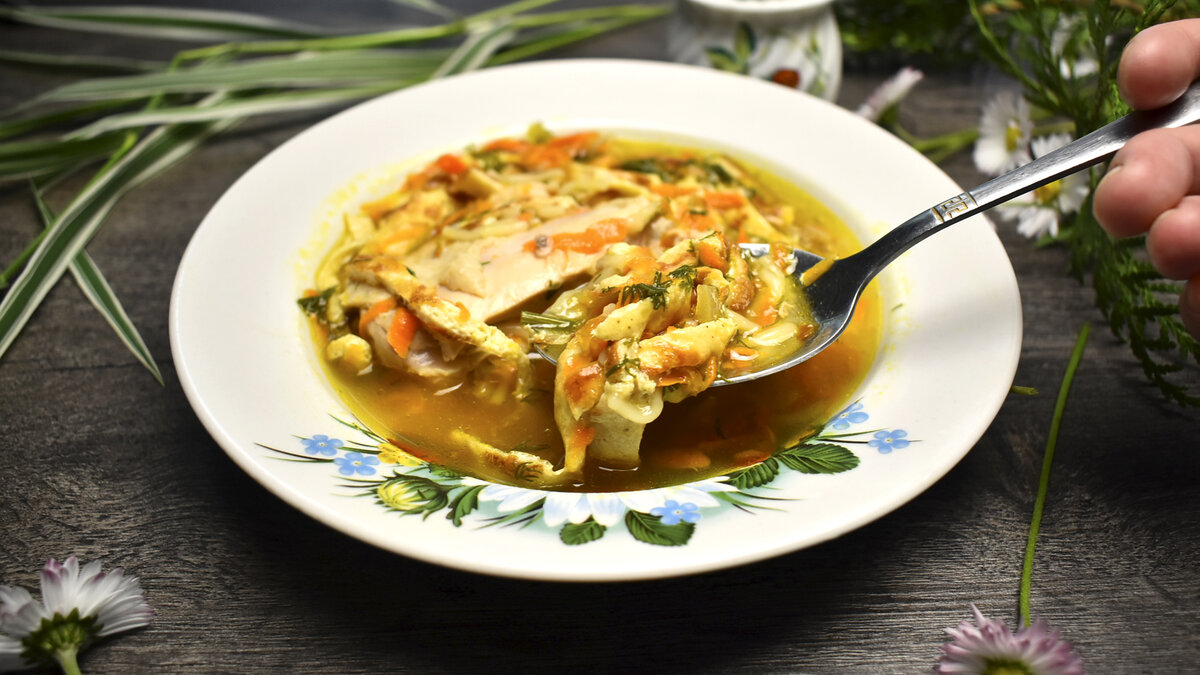 Обожаю лёгкие в приготовлении супчики. Готовлю разные практически каждый день, ведь мужу после работы и сухой пиши, хочется чего-то жидкого. Недавно, я порылась в старых записях папы (а он у меня очень любил готовить) и нашла рецепт прекрасного первого блюда. А именно суп с курицей и яичными блинчиками. Честно говоря, после первого раза приготовления я была приятно удивлена вкусом. Решила, что и Вам обязательно надо знать рецепт его приготовления. Супчик лёгкий, но в то же время сытный. Мне с головой хватило одной тарелочки, чтобы наесться. Советую Вам обязательно приготовить этот вкусный суп! Он Вам понравится! 👨🍳 Давайте уже готовить! Список продуктов я оставлю в конце статьи, для Вашего удобства. У меня 3 куриных бедра, завесили примерно на 600 г. Разрезаем их на пополам. Можете использовать другое мясо на свое усмотрение, например говядину или свинину. Варю суп в кастрюле на 2 л. Скидываем мясо в кастрюлю. Заливаем водой. Ставим на плиту на большой огонь, доводим до кипения, сни