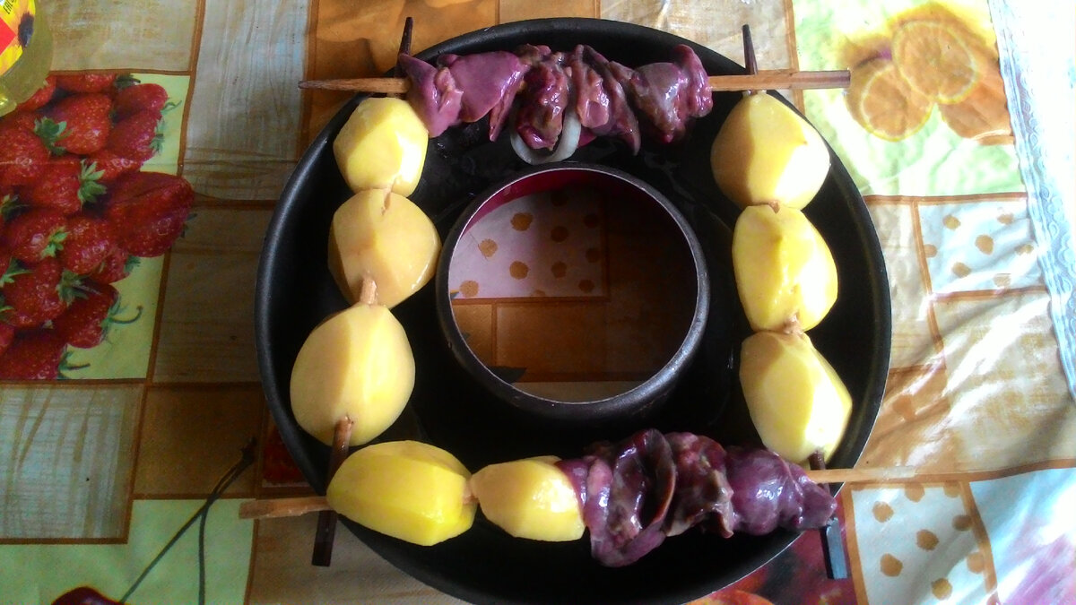 Очищенный и подсоленный картофель необходимо разрезать на 2 половинки, и, смазав растительным маслом, нанизать на шпажку. Субпродукты замаринованные смешиваю с печенью, немного солю, перчу и также насаживаю на шпажки. Для детей делаю отдельные шашлыки. На 1 шпажку сразу насаживаю картофель и печень с сердечками. Этого вполне достаточно для детского организма. Два полноценных шампура с картошкой и печенью они не