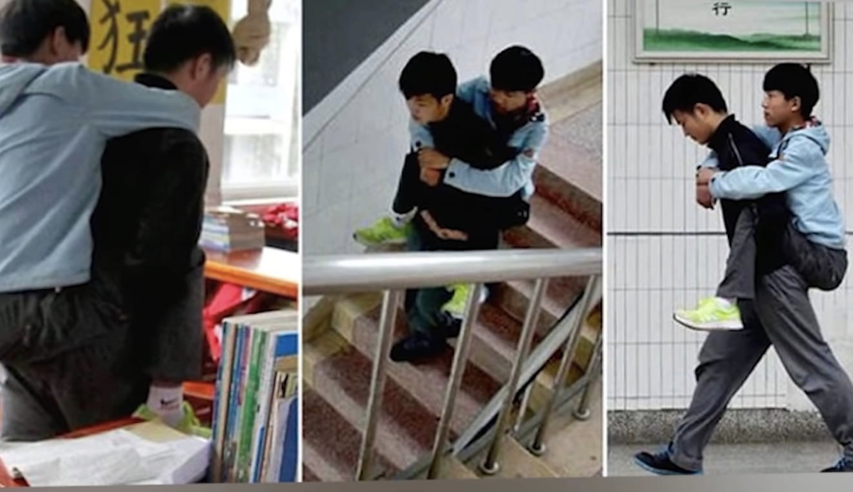 Этот парень 3 года носит своего одноклассника на руках, который просто мечтает ходить в школу