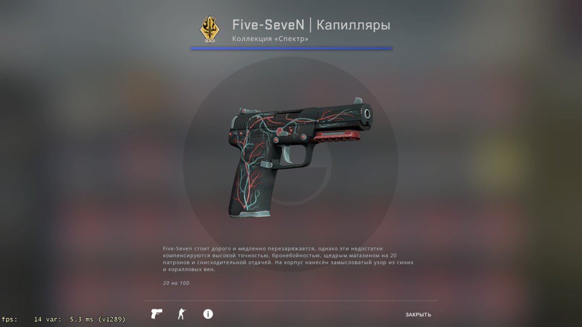 1. Five-SeveN | Капилляры. Нашу подборку открывает скин Five-SeveN | Капилляры. Красивый и очень дешевый скин. В качестве После полевых испытаний цена составляет 5 рублей. На корпус нанесён замысловатый узор из синих и коралловых вен. 20 на 100. Коллекция «Спектр» 2. Five-SeveN | Испытание огнём. В качестве После полевых испытаний цена составляет 5 рублей. а фиолетовую основу с металлическими частицами нанесён узор в виде серебряного пламени. Обнаружен элемент: цезий. Коллекция «Решающий момент» 3. Five-SeveN | Неистовый даймё. Очень красивый FS. Мне нравится). В качестве После полевых испытаний цена составляет 8 рублей. Графический дизайн выполнен в черно-фиолетовой расцветке. Как будешь править? Коллекция «Гамма» 4. Five-SeveN | Апельсиновая корка. Не самое лучшее решение для покупки. В качестве Прямо с завода цена составляет 39 рублей. Рисунок нанесен баллончиком с использованием трафарета из спутанной клейкой ленты. Настоящая мощь — в искусной аппликации. Коллекция «Dust 2» 5.