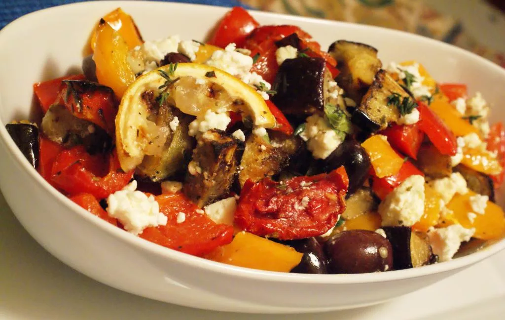 После запекания смешать овощи, добавить листья салата или капусту, 2 ч л оливкового масла, 50 гр консервированного зеленого горошка. Можно присыпать кунжутом.