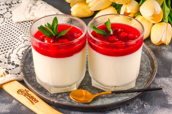 Удивительно благоухающая панна-котта с вишенкой — топовый десерт для жаркого лета. Создать ее очень очень просто, необходима всего лишь вишня или же вишневый топинг. Подавать только охлажденной. Ингредиенты: Способ готовить Панна-кота с вишней Приготовьте необходимые продукты, сливки необходимо взять 10-20 процентов но не более! Слейте сливки в сотейник или казан, поставьте посуду на плиту и подогрейте, но не до кипения. нагреваем примерно до восьмидесяти и не более девяносто градусов. Засыпьте сахар, потом ванильный сахар после очень хорошо перемешайте их Засыпаем желатин и перемешиваем. Оставляем для набухания на пять, восемь минут, потом заново перемешиваем, поднимая его со дна. Немного дайте сливкам остыть и вылейте их в формы можно разлить по стаканам или же чашкам. Поставьте емкости в холодильник на один час что бы они застыли минут на 20-30 . Вот и пришло время для вишни, ее нужно очистить от косточек, засыпаем в кастрюлю или в любую емкость для варки. Добавля