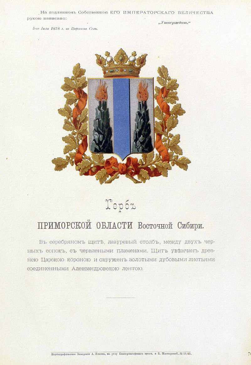 Герб Приморской области Российской империи утверждён 5 июля 1878 года. В серебряном щите лазуревый столб, между двух чёрных сопок, с червлёными пламенами. Щит увенчан древней царской короной и окружён золотыми дубовыми листьями, соединёнными Александровской лентой [1]. Откуда в гербе Приморской области камчатские вулканы?