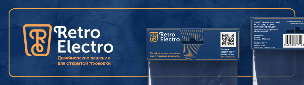 Что нам стоит бренд построить Задачи «под ключ» – отличный повод испытать свои силы, а также от формирования идеи до первой продажи проследить возникновение чуда… В этот раз нам заказали новый бренд с полным, тотальным даже продвижением в нашем любимом направлении – изделий для дизайнерских интерьеров. Нам заказали отработать айдентику для новой линейки продукции для открытой проводки, а также составляющие – втулки, изоляторы, распаячные коробки, провода и электроустановочные изделия. Этот тренд широко используется в деревянном домостроительстве, помещениях в стиле «лофт», а также для гаражей, парковок и других пространств, где не требуется скрывать проводку. В «меню» вошли: Стильное решение для стильной проводки Несмотря на «нулевую» историю бренда RetroElectro, нам все же пришлось соответствовать некоторым правилам и ограничениям, которые озвучил заказчик: В основе знака, графического элемента – монограмма, заключенная в закругленную перевернутую трапецию. Именно она стала тем «мост