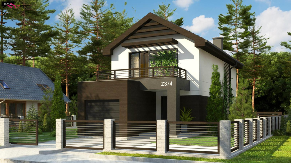Z374 Проект двухэтажного дома в современном стиле, подойдет для строительства на узком участке.