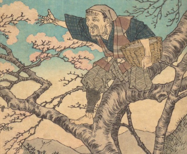 Старик подоткнул кимоно и приготовился взобраться на дерево. Сказав “Извините”, он взял горшок с пеплом, который принес с собой, и начал взбираться на дерево, все с большим интересом наблюдали за его движениями.