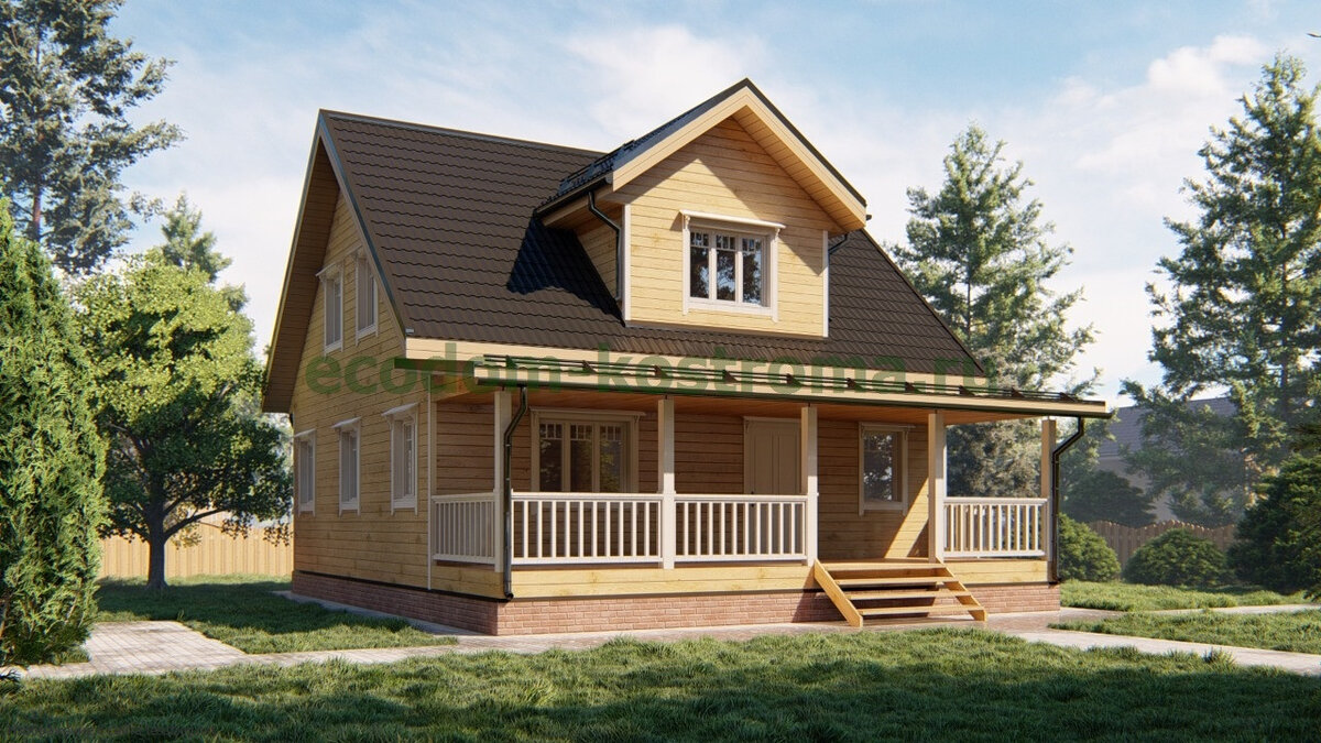 Дом из бруса "Чистые Боры" ДБ-173 от строительной компании "ЭкоДом-Кострома". Площадь застройки: 8 x 9 м, Общая площадь: 137 м2, стоимость: от 904 000 руб. Дом из профилированного бруса 145х145 будет стоить 1 042 000 руб, из бруса 145х190 - 1 222 000 руб. Фундамент в стоимость не входит. Фундамент из винтовых свай добавит к стоимость +126 000 руб, из ж/б свай - 160 000 руб, ленточный - 401 000 руб. В стоимость входит рубероид. Если нужна металлочерепица, надо добавить +278 000 руб. Дом уютный и очень красивый, компактный и в то же время места в нем достаточно. Обратите внимание, на первом этаже отличная просторная терраса. Кроме того здесь гостиная, кухня, спальня, санузел и топочная. Второй этаж выделен под еще три спальни и гардероб. Хотя по нашему мнению на 4 спальни одного санузла мало, на втором этаже можно найти место для хотя бы еще одной ванной комнаты.