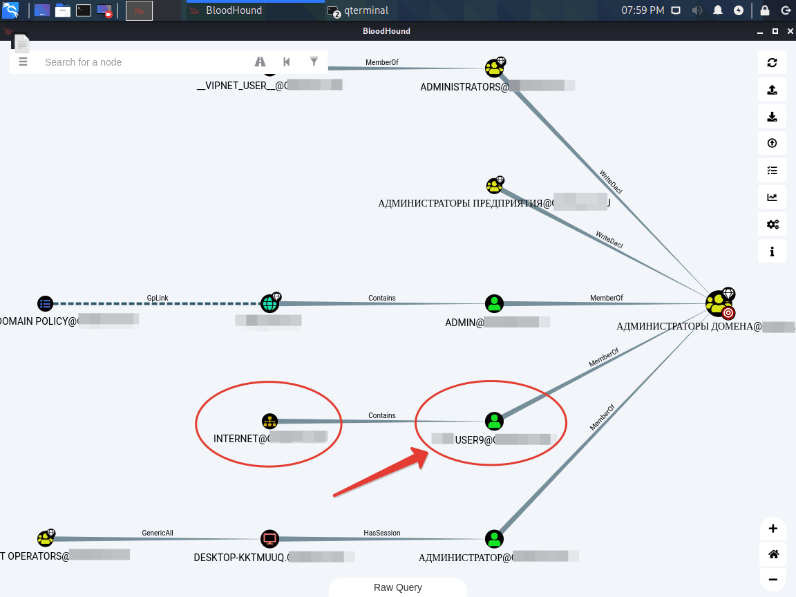 Автоматически построился соответствующий граф. При внимательном рассмотрении можно найти что-нибудь интересненькое. Вот например, сходу обнаружился пользователь ****USER9 входящий в группу Администраторов домена. Причём пока непонятно, это misconfig или умышленно оставлено. Но по крайней мере у него может оказаться слабый пароль и, в конечном итоге, это ещё + одна цель для атаки на пользователя.