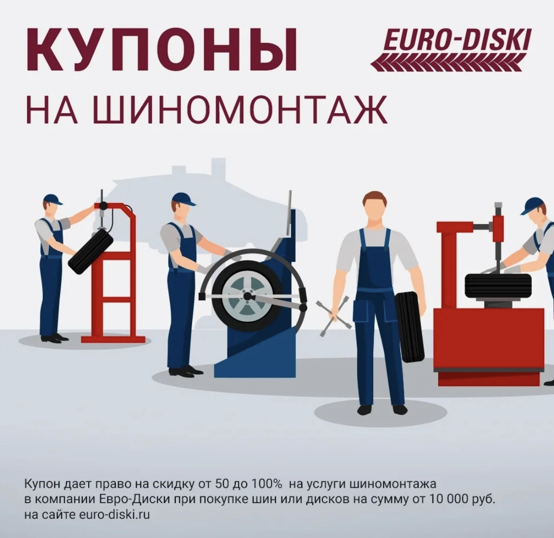 ЕВРО-ДИСКИ. УДОБНЫЙ.ИНТЕРНЕТ.МАГАЗИН. Мы более 15 лет занимаемся продажей авто и мото шин, а также колёсными дисками. 1 заказ ➡️ 1 купон ➡️ 1 автомобиль #евродиски ❗Купон дает право на скидку от 50 до 100% на услуги шиномонтажа в шинных центрах компании Евро-диски, а также на пунктах выдачи у парнеров. ⠀ УСЛОВИЯ ВЫПОЛНЕНИЯ ШИНОМОНТАЖНЫХ РАБОТ: ☑️ Единоразово ☑️ Строго на приобретенный товар ☑️ Применительно на 1 автомобиль не более 5 колес. 4+1 запасное, при необходимости ю ☑️ Воспользоваться купоном можно в течение 30 дней с момента получения заказа ⠀ СХЕМА ДЕЙСТВИЙ 1️⃣ Совершаете покупку в магазине ЕВРО-ДИСКИ 2️⃣ Записываетесь на шиномонтаж 3️⃣ Получите скидку или бесплатный шиномонтаж ⠀ СКИДКА ЗАВИСИТ ОТ СУММЫ ЗАКАЗА ⠀ 👉🏻МОНТАЖ ПЛАТНЫЙ Сумма вашего заказа составила менее 10 000 Р ⠀ 👉🏻-50% СКИДКА НА МОНТАЖ Сумма вашего заказа составила от 10 000 Р до 15 000 Р ⠀ 👉🏻МОНТАЖ БЕСПЛАТНЫЙ Сумма вашего заказа составила от 15 000 Р и более ⠀ БЕСПЛАТНЫЙ ШИНОМОНТАЖ НА ЛЕТНИЙ АССОРТИМЕНТ