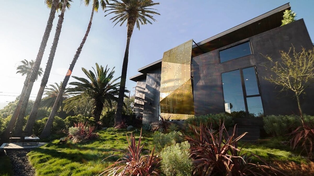 Этот роскошный дом расположен у подножия парка Раньон Каньон, в одном из самых очаровательных районов старого Голливуда. Дизайнеров вдохновил итальянский модернизм в сочетании с японской архитектурой – изысканный симбиоз стал уникальным стилевым решением для проекта этого двухэтажного особняка. Это дом с брутальным характером и тщательно продуманными деталями, каждый его элемент, от света до фактур отделки, воплощает утонченный гламур и беспрецедентный комфорт. Особняк был построен в 2017 году, его архитектура является квинтэссенцией концепции «open-air». Уже при входе в дом открывается пространство гостиной-столовой, переходящее в живописный и уютный внутренний дворик. В комфортной, стильно обставленной гостиной есть настоящий дровяной камин в современном минималистичном портале. Прозрачные стены и высокие потолки создают масштаб во всех внутренних помещениях особняка. Изюминкой этого дома является оригинальная 21-метровая перфорированная латунная вставка на фасаде, резко контрастирую