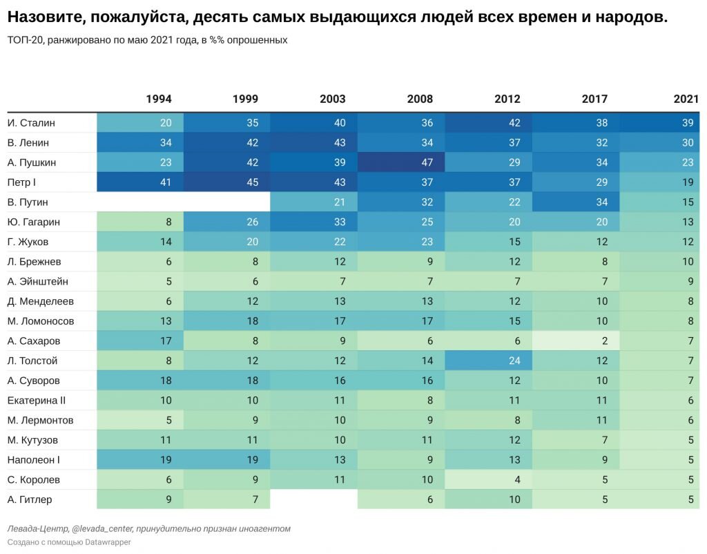В мае Левада-Центр провел очередной опрос. Результаты интересные. Организация признана у нас в стране иноагентом, поэтому я бы ожидал других результатов. Хочу о них поговорить. Дело в том, что по данным "прозападной" организации И.В.Сталин, начиная с момента развала СССР и до сего момента в народной памяти является топовой личностью, а последние 9 лет - безусловный лидер. Годы идут, а он лишь крепчает и молодеет, подавляя своим авторитетом Ленина, Пушкина, Петра I и свежепоявившегося и уже упавшего в рейтинге нынешнего Президента. Это странно. Статус иноагента говорит о том, что организация не провластная. В этом смысле всё верно: действующий Президент совсем не лидер опроса. Если организация прозападная и подтасовывает результаты так, как это надо Западу, то почему она превозносит Сталина? Это разве какой-то оппозиционер? Я бы понял, если бы они топили за Навального или Ходорковского. Но тут - какой смысл? Если организация нейтральная, то они публикуют просто информацию... Похоже,