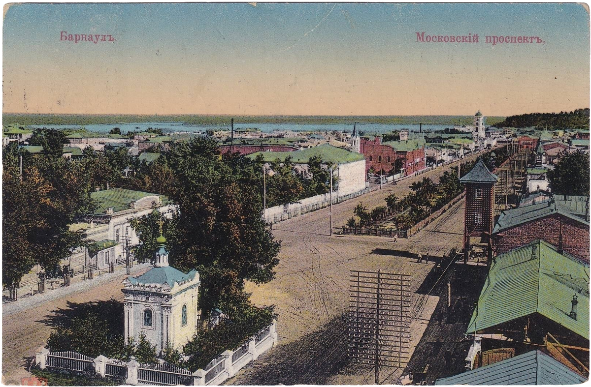 Расположен на юге Западной Сибири в месте впадения реки Барнаулки в Обь. Возник в 1734—1735 годах и развивался как посёлок при сереброплавильном заводе Демидова. В 1766 году русский изобретатель Иван Ползунов на берегу реки Барнаулки построил первую в России паровую машину, а в 1771 году Барнаулу присвоен статус горного города. Отмена крепостного права и истощение природных ресурсов привели к закрытию в 1893 году сереброплавильного завода. Город стал крупным купеческим центром. Вид на рынок Общий вид Барнаула Улица Льва Толстого Вид на гору от Соборного переулка Московский проспект Петропавловская улица Пушкинская улица Собор Соборный переулок Улица Льва Толстого Духовное училище Женская гимназия Буткевич Реальное училище императора Николая II Демидовская церковь Казенная женская гимназия Римско-католический костёл Вид на женский монастырь с реки Казанский монастырь