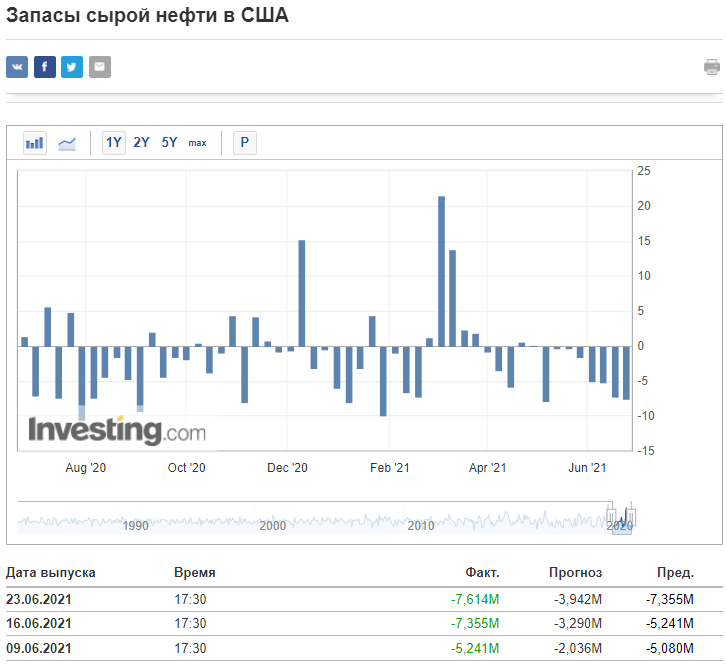 Перспективы цен на нефть, на мой взгляд немного туманны. Есть повод для снижения цен, и есть повод для продолжения роста. Причем я допускаю резкое снижение, но не думаю, что это будет носить долгосрочный характер. Давайте взвесим все за и против. Запасы сырой нефти седьмую неделю показывают снижение. Это безусловно поддерживает цены на нефть. Более того, запасы сырой нефти и запасы бензина, в крупнейшем в стране хранилище в Кушинге, упали на прошлой неделе. Учитывая, что впереди сезонный спрос на бензин, можно сделать вывод, что дефицит на рынке действительно вырастет во втором полугодии. Помимо этого, производство бензина в США, по данным энергетического агентства, на прошлой недели составили 9,44 млн.барр./день. И это уже почти докризисный уровень. Это указывает на восстановление экономики, и на поддержку спроса. Все это факторы поддержки цен на нефть. Заставить цены снизиться могут решения ОПЕК+. На следующей неделе состоится министерская on-line встреча, где вероятнее всего будет п