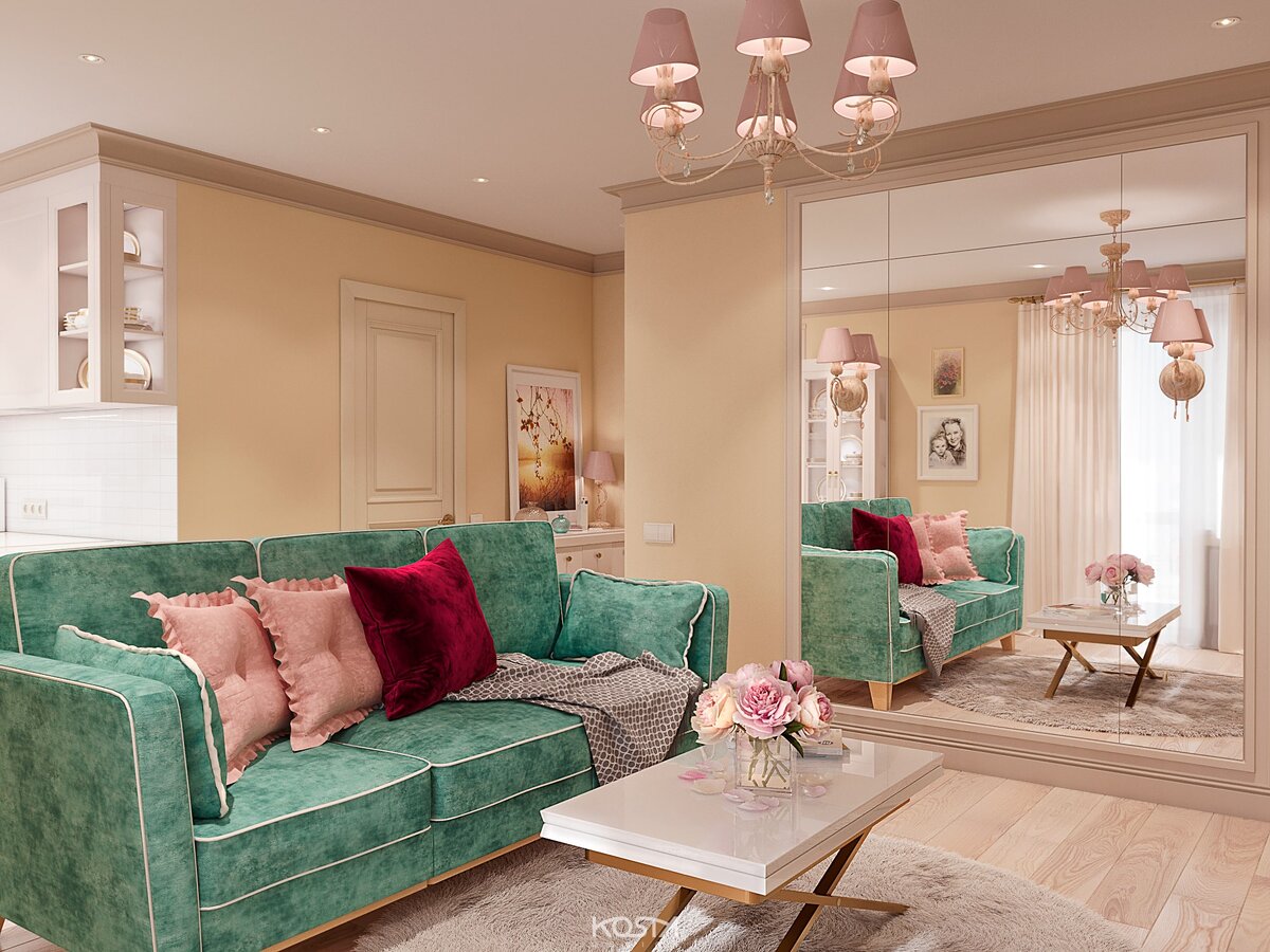Стильный цветочный дизайн-проект для успешной девушки с маленькой дочкой. Пожелания: использование множества ярких жизнерадостных оттенков; на лоджии разместить подвесное кресло для отдыха, раскладной диван и рабочую зону. Утонченная светлая кухня-гостиная с акцентным мятным диваном, который был привезен из Санкт-Петербурга и стал настоящим центром пространства. Цветочные мотивы ненавязчиво переходят из комнаты в комнату, занимая своё место. На лоджии получилось пространство для отдыха, напоминающее небольшой садик. Разместился удобный диван, сделанный на заказ, который можно использовать как дополнительное спальное место для гостей. Получился просторный и красочный интерьер, включивший в себя всё необходимое для комфортной жизни семьи.