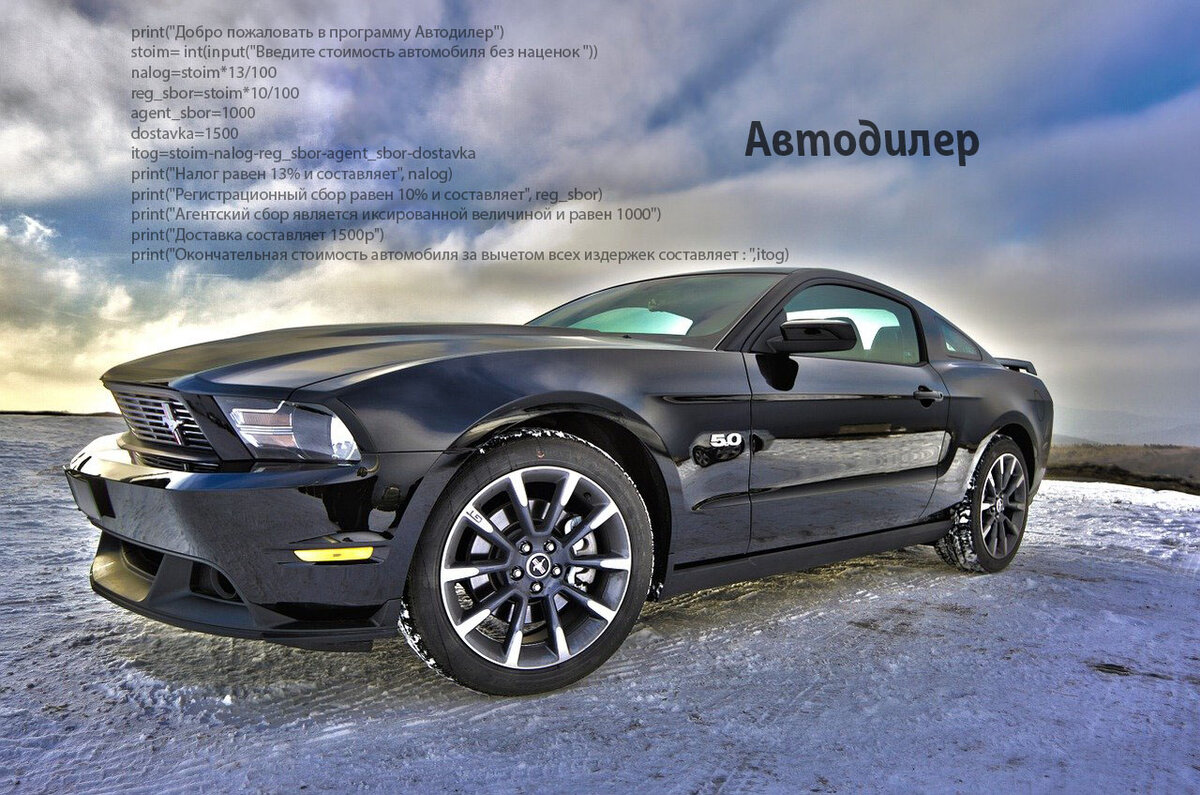 Как понятно из предыдущих статей я изучаю Python. И закончив изучать 2-ю главу была поставлена задача, которая звучит следующим образом. Необходимо написать программу "Авотодилер" в которой пользователь может ввести стоимость автомобиля без наценок. А программа должна прибавлять к этой стоимости: налог, регистрационных сбор, агентский сбор и стоимость доставки машины. Звучит все довольно таки просто. Ну это и не удивительно ведь еще нет ни каких функций, методов и т.д. Это по идее даже и программой сложно назвать, просто выводишь текст на экран и различные математические функции.) Код по итогу выглядит вот так: print("Добро пожаловать в программу Автодилер") stoim= int(input("Введите стоимость автомобиля без наценок ")) nalog=stoim*13/100 reg_sbor=stoim*10/100 agent_sbor=1000 dostavka=1500 itog=stoim-nalog-reg_sbor-agent_sbor-dostavka print("Налог равен 13% и составляет", nalog) print("Регистрационный сбор равен 10% и составляет", reg_sbor) print("Агентский сбор является иксированной в