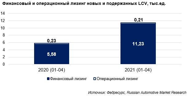 По данным RAMR, по итогам января-апреля 2021 г. в финансовый и операционный лизинг выдано 11,4 тыс. легких коммерческих автомобилей, что на 97% больше результатов 2020 г. Из них новых – 11,0 тыс. ед., это на 93% больше АППГ.