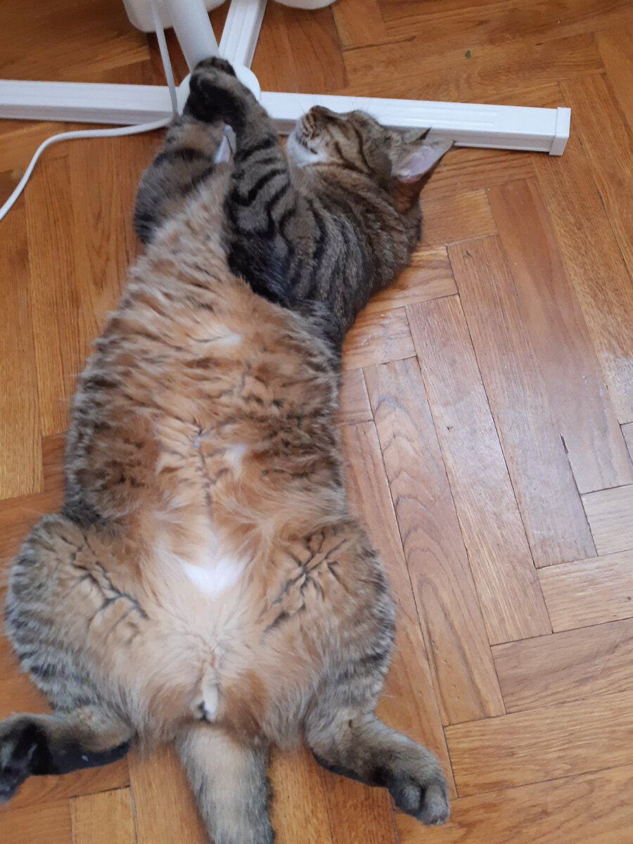 В зону Черноземья нагрянула жара. После пасмурного неба прохладного мая и и такого же начала июня нас накрыл циклон, принесший жаркий воздух. Температура почти под 40, на небе - ни облачка... Выходишь на улицу - словно попадаешь на сковородку с крышкой: горячий воздух сверху, снизу, справа и слева. Ветерок не приносит облегчения - он такой же прогретый, как воздух. Дома так же тяжко. Кондиционеров у нас нет - муж не ставит. Куча вентиляторов. Я готова обниматься с ними, дальше двух метров отходить не хочется. Но и они уже стали гонять теплый воздух, почти не охлаждая наши разгоряченные тела. Кайфово в подъезде. Мелькает мысль переехать в его темную прохладу... Тяжко приходится нашим котам. Влияние жары отражается на их аппетите. Первым хуже стал есть Масик. Боня пока держится, но и у него уже вчера снизились темпы поглощения пищи: даже его любимая говядина уже не так быстро сметается. Ищут по квартире прохладные места. Переместились на пол. Масик в спальне упал у вентилятора, ближе к